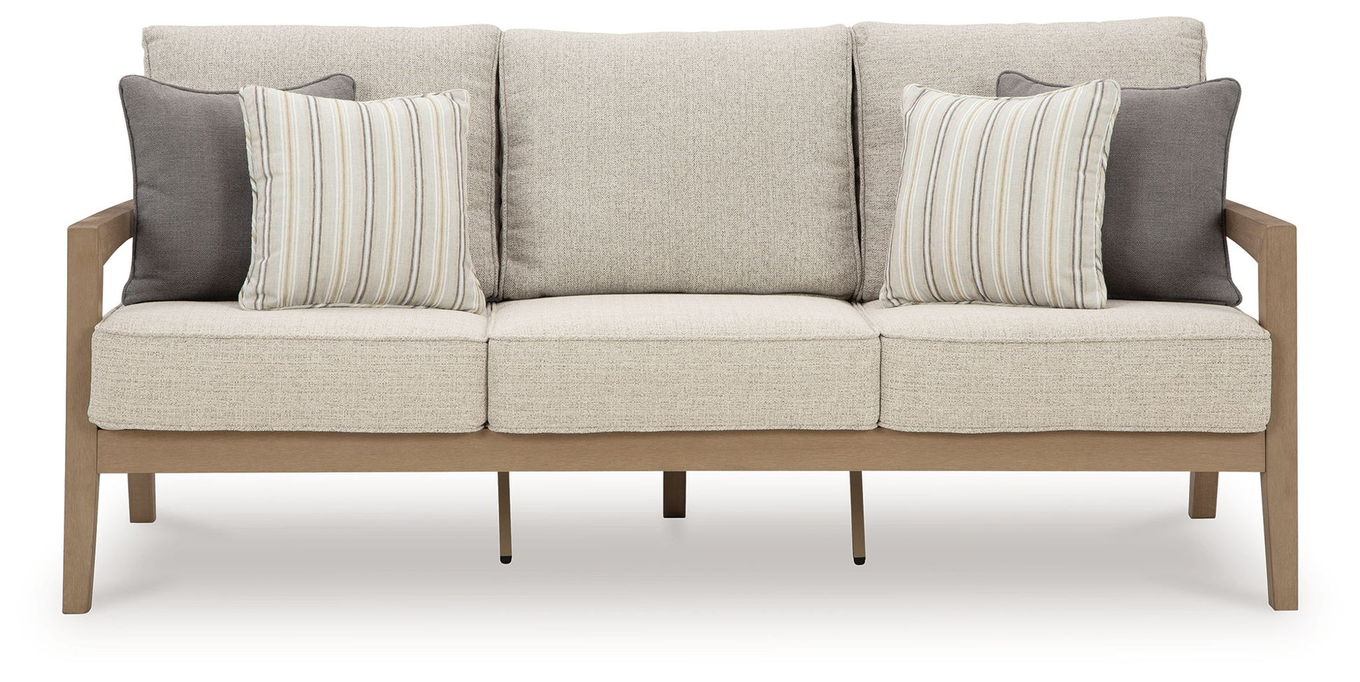 This sofa is a beautiful addition to any outdoor living space. Effortless in its simplicity, this piece echoes your easygoing sensibilities. Combining durable, cutting-edge engineered materials, its Weatherwood construction enhances the contemporary design. Rest assured, the thick cushions and accent pillows are wrapped in high-performance fabric that’s fade-resistant, stain-resistant and a breeze to clean. Pair with the matching loveseat and swivel lounge chair for a spectacular seating arrangement.